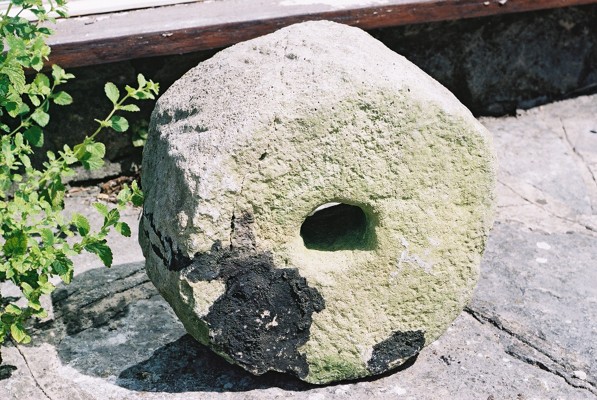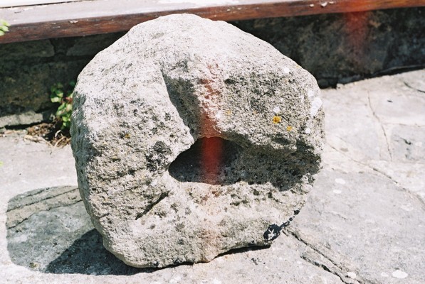 - desc Block of limestone, approx. hexagon about 35cm diam. and 15cm thick.